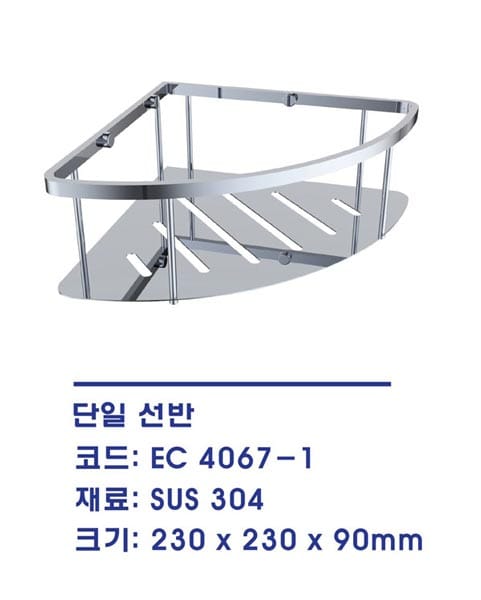 Kệ góc 1 tầng Ecobath EC-4067-1. Đây là phụ kiện phòng tắm thương hiệu công nghệ của Hàn Quốc được sản xuất tại Trung Quốc, nhập khẩu nguyên bộ. Chất liệu kệ chuẩn Inox 304 không rỉ, chống chịu môi trường ẩm ướt, độ bền cao.